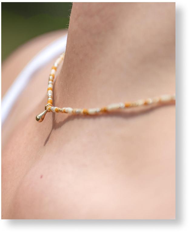 Este collar es un hilo de sutileza que guía la mirada, donde la luz se posa con delicadeza y transforma lo simple en eterno.